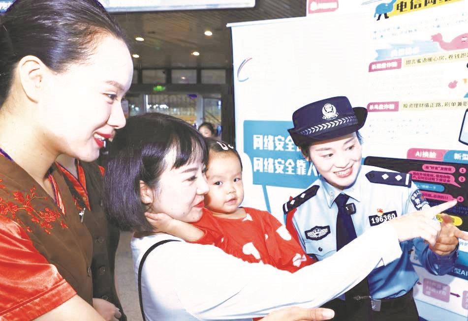 9月15—21日,以“网络安全为人民,网络安全靠人民——以高水平安全守护高质量发展”为主题的国家网络安全宣传周在全国范围内开展。图为9月15日,湖北武汉铁路公安处武汉站派出所民警在武汉站为旅客讲解网络安全知识。