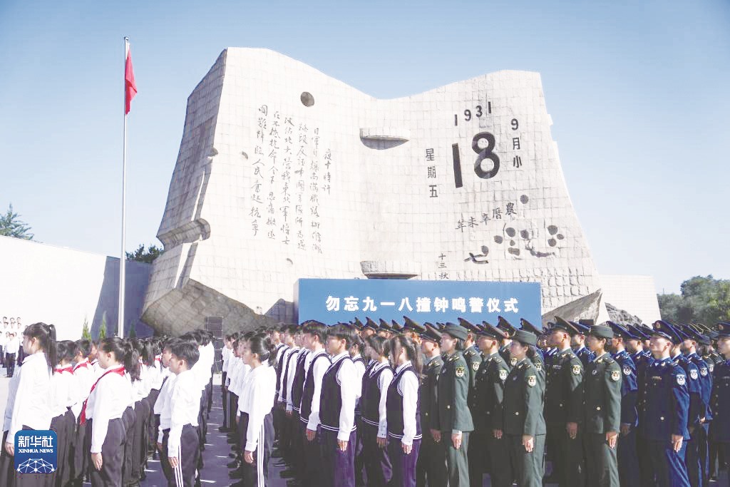 今年是九一八事变爆发94周年。9月18日上午,“勿忘九一八”撞钟鸣警仪式在沈阳“九·一八”历史博物馆残历碑广场举行。图为“勿忘九一八”撞钟鸣警仪式现场。