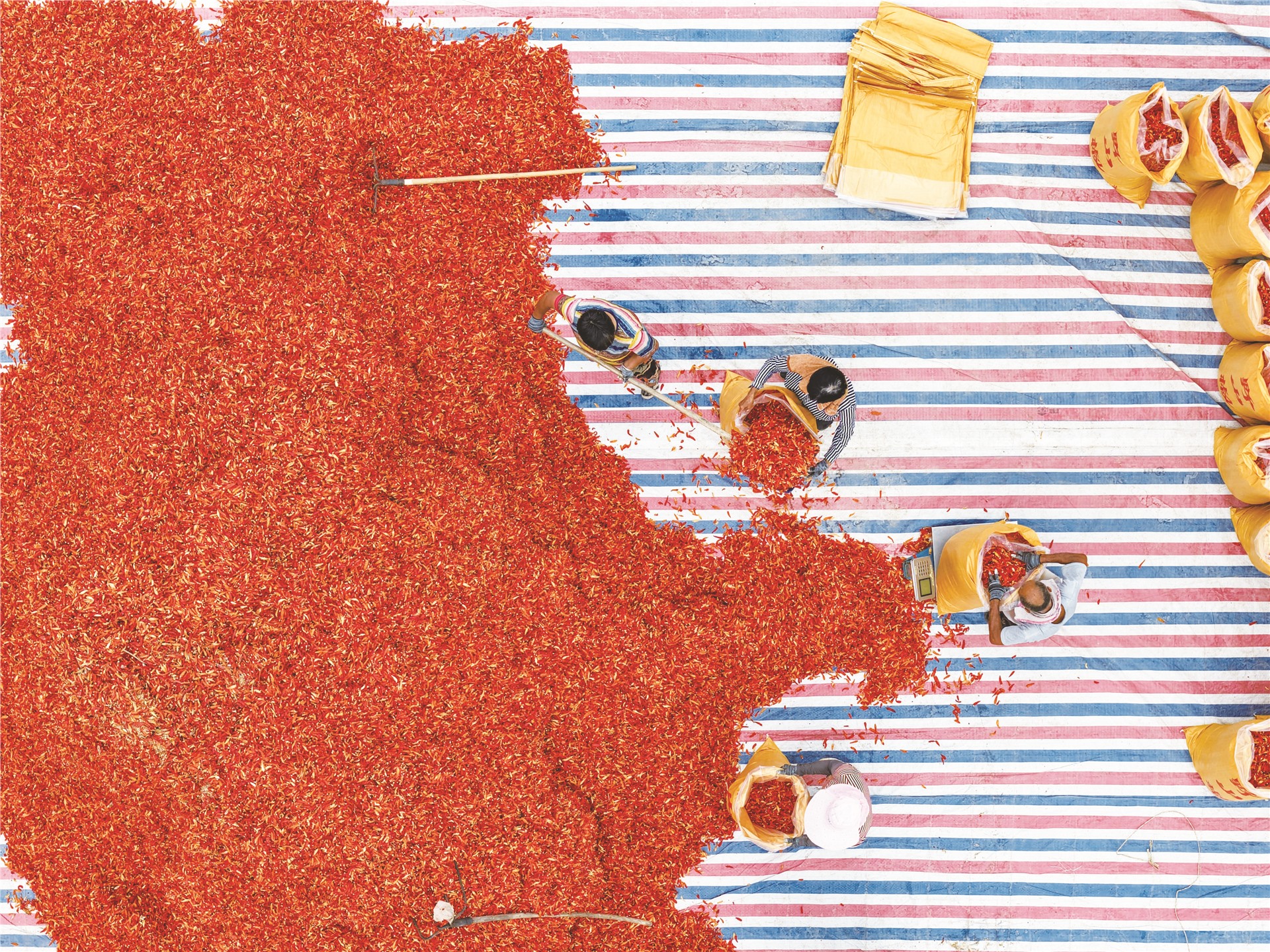 金秋时节,在安徽省亳州市谯城区古城镇油河村,当地农民抢抓农时晾晒、加工、打包辣椒供应市场,呈现一派繁忙的丰收景象。