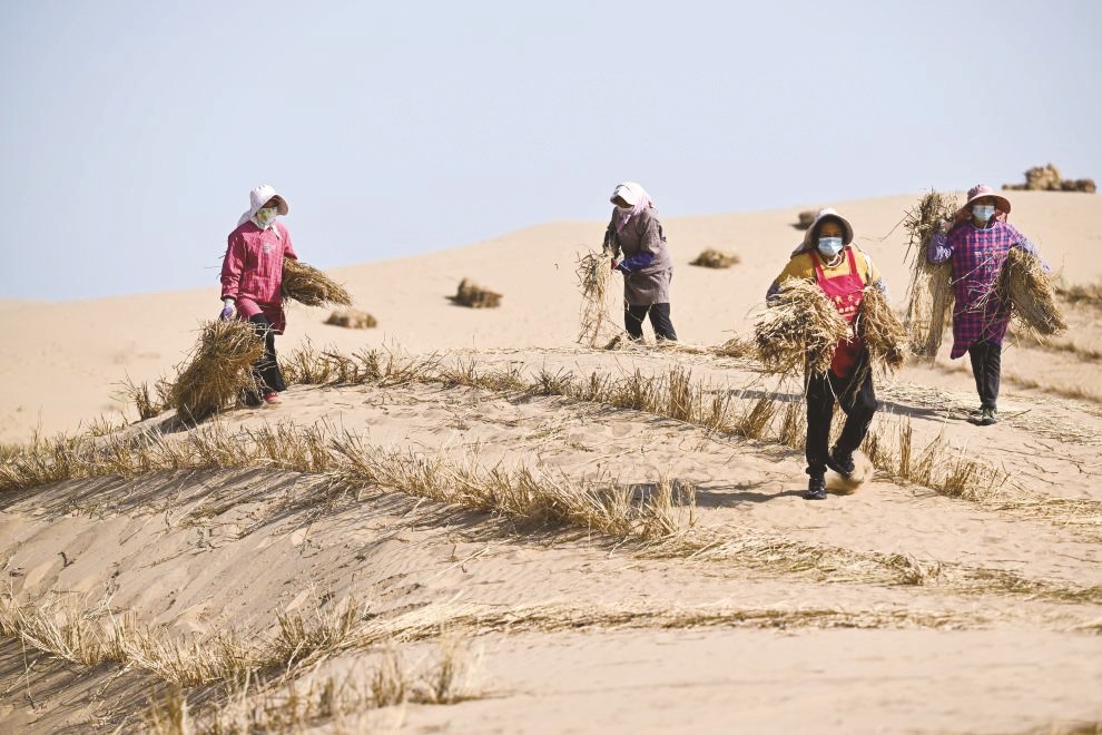 ▲工人在杭锦旗境内的库布其沙漠里搬运稻草。