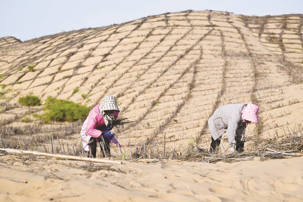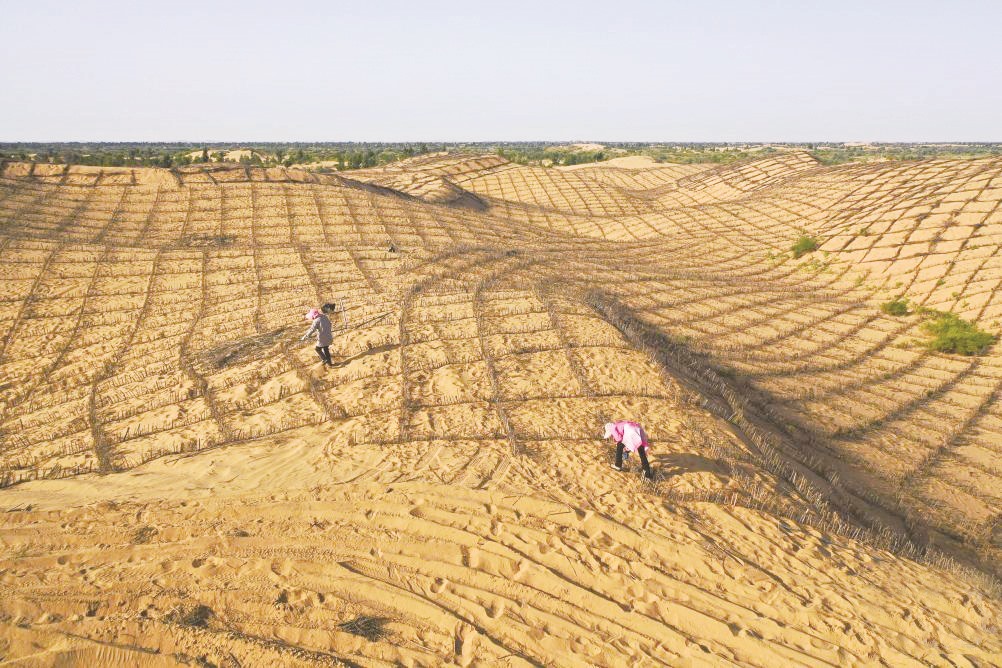 ▲工人在杭锦旗境内的库布其沙漠里铺设沙障。