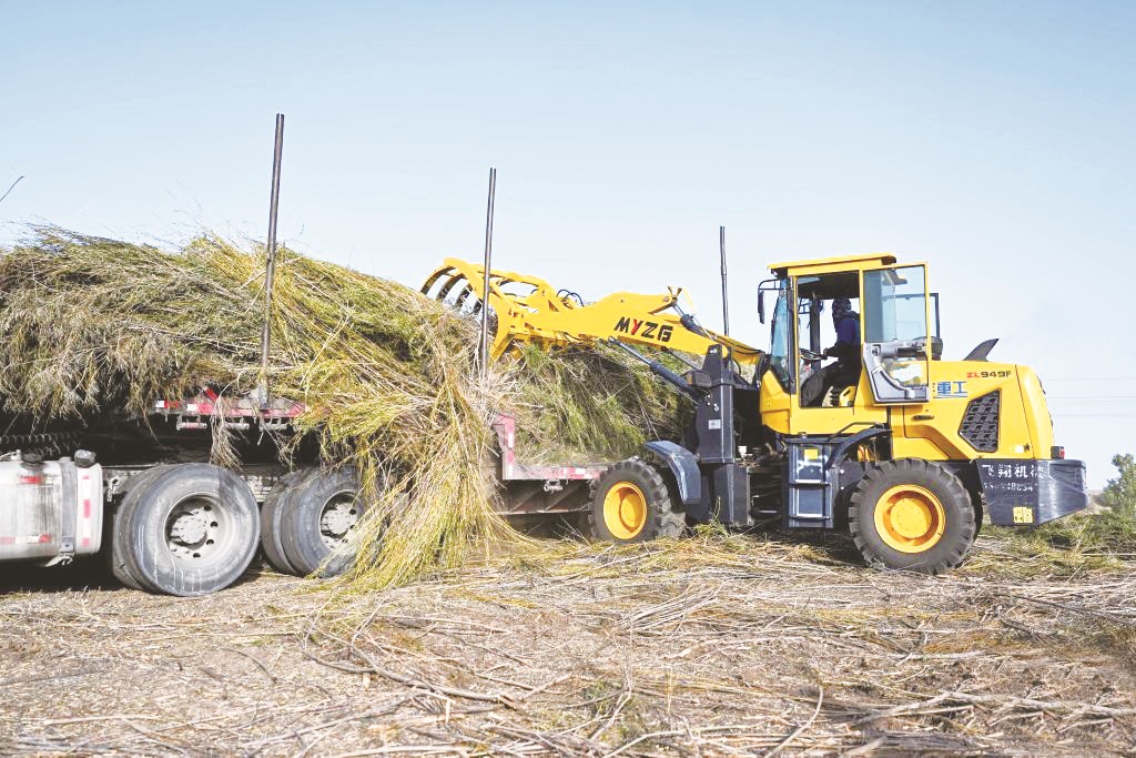 ▲工人驾驶机械在杭锦旗境内的库布其沙漠里卸载沙柳。