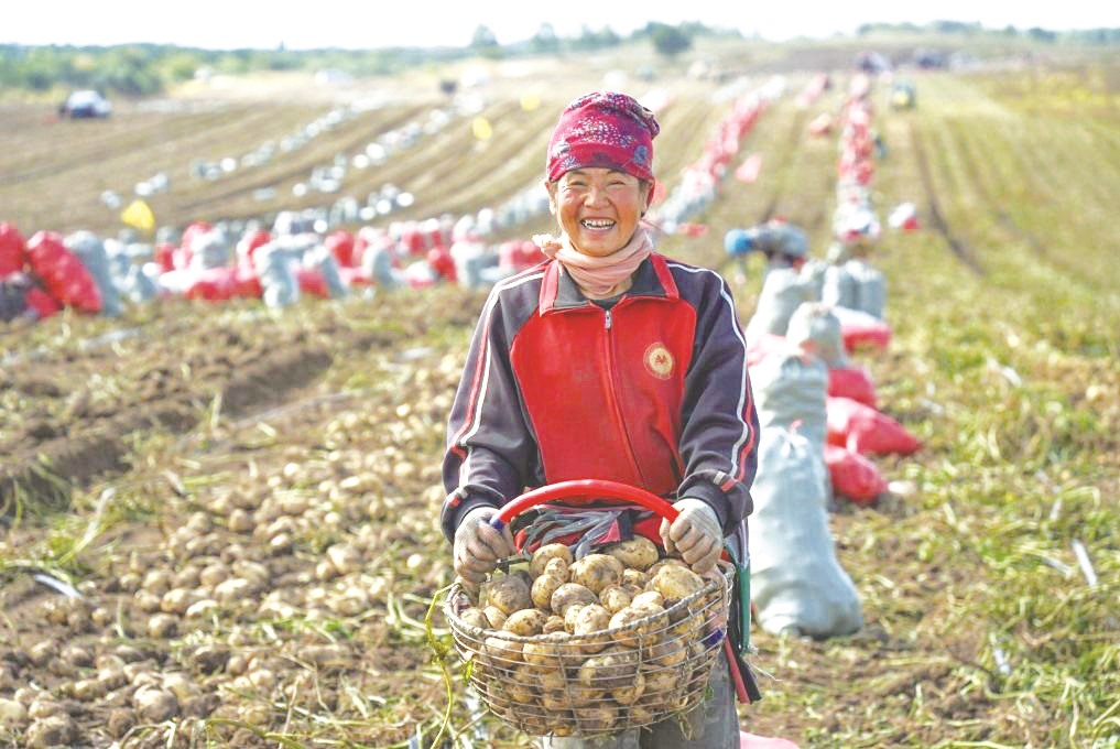金秋时节,各地农民在田间地头忙碌,脸上洋溢着丰收的喜悦。图为9月22日,河北省承德市围场满族蒙古族自治县御道口镇农民在田间展示收获的马铃薯。