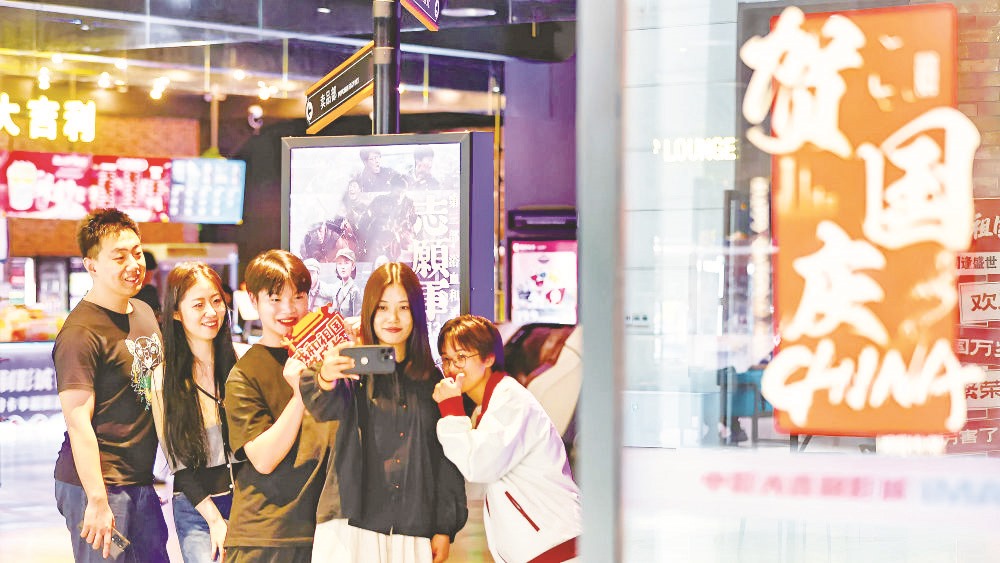 10月4日,在天津市滨海新区一影城,观众与电影海报合影。(杜鹏辉/摄)