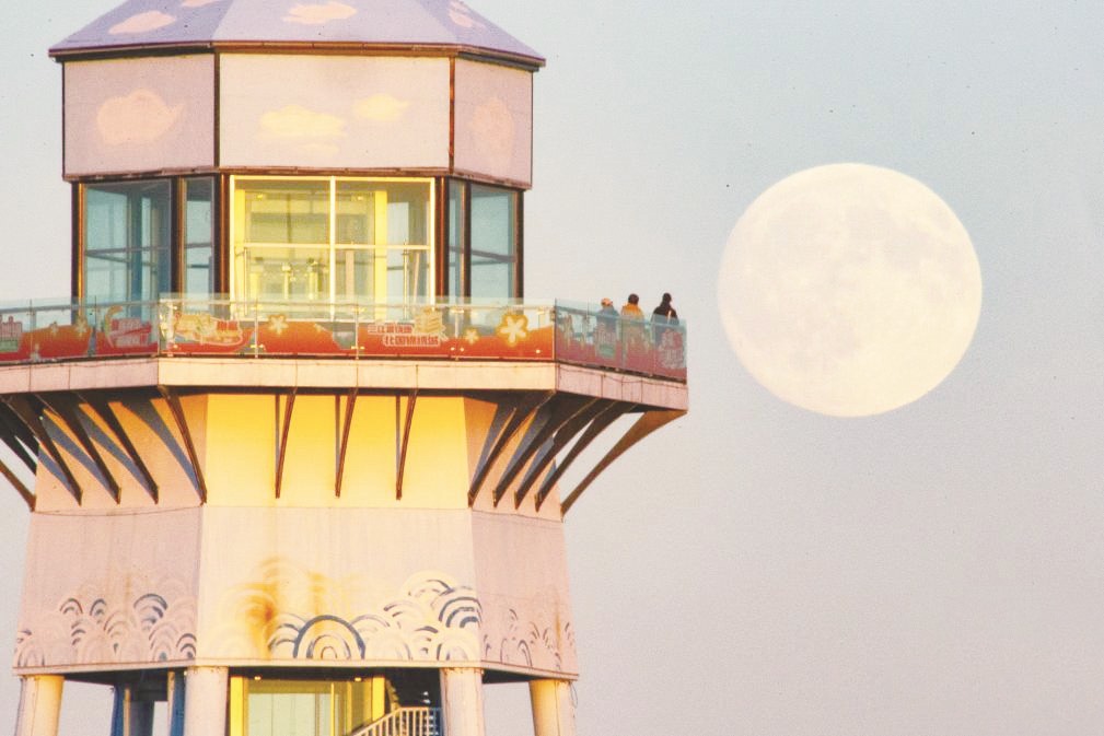 10月6日,人们在黑龙江省佳木斯市富锦万亩水稻公园赏月。(曲玉宝/摄)