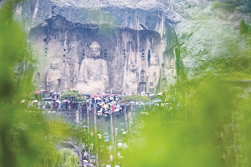 10月1日,游客冒雨游览位于河南省洛阳市的龙门石窟。(李卫超/摄)