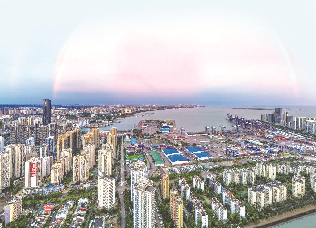 10月6日清晨,海口市上空出现彩虹。今年第21号台风“麦德姆”对海口的影响趋于结束,海口城区逐步恢复正常秩序。(蒋聚荣/ 摄)