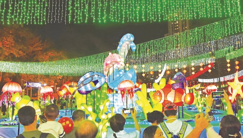 彩灯以十五运会和残特奥会吉祥物展示香港承办的竞赛项目,以不同运动造型环绕闪耀的会徽;高约12米的彩灯“火亮殊荣 花庆盛典”,外形犹如华丽冠冕,象征粤港澳三地团结和融合;传统花灯“舟影华灯·月满非遗”将龙舟、粤剧、月饼、港式奶茶等诸多元素融入其中。 图为10月6日,市民在香港维多利亚公园欣赏中秋彩灯。 (陈铎/ 摄)