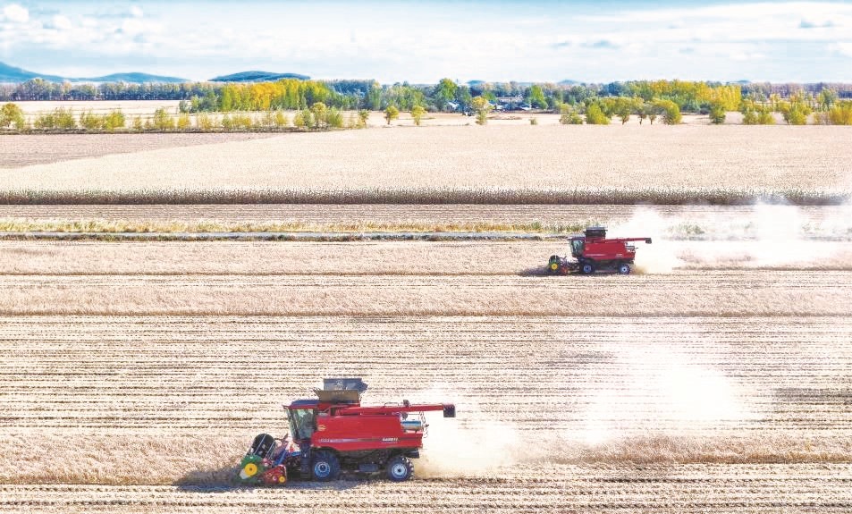 寒露时节,黑龙江省各地抢抓农时忙农事,田间地头一片繁忙景象。图为10月8日,在黑龙江省佳木斯市富锦市砚山镇,农机在进行大豆收获作业。(曲玉宝/ 摄)