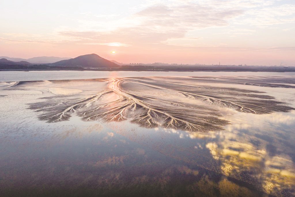 每年农历八月中下旬,浙江钱塘江大潮都会呈现“海阔天空浪若雷”的壮丽奇观。大潮过后,潮滩上形成形态各异的“潮汐树”景观,为游客观潮增添趣味。图为在浙江嘉兴海宁拍摄的晨曦映照下的“潮汐树”(无人机照片)。