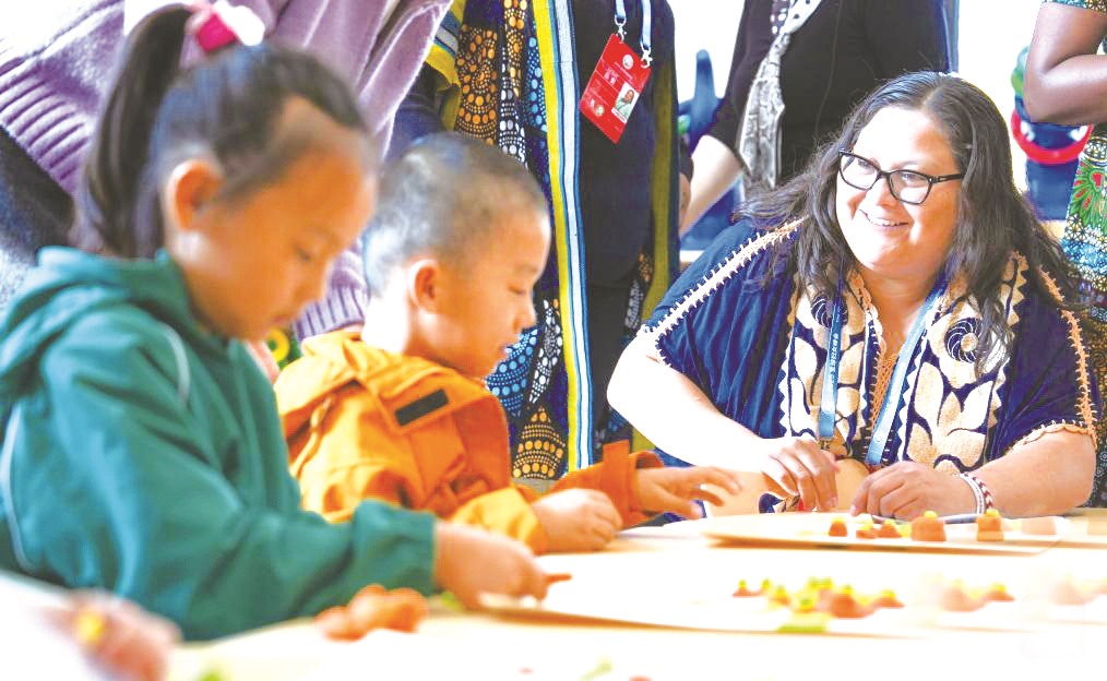 10月13日,全球妇女峰会在北京举行。图为全球妇女峰会参会嘉宾在北京市顺义区妇女儿童社会服务中心和孩子们一起做手工。