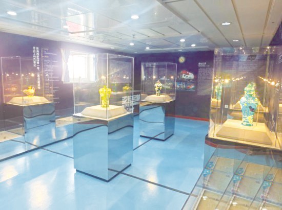 ▲图为“南海之梦”号邮轮上全新推出的“深蓝宝藏——南海西北陆坡一号、二号沉船考古成果特展”主题展览。