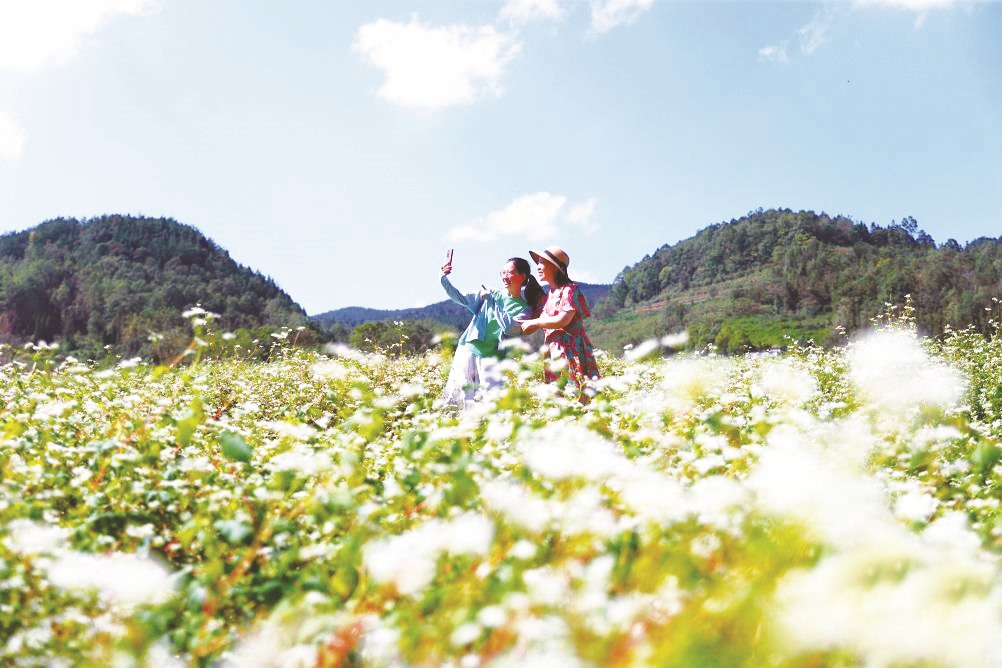 ▲10月10日,游客在重庆市黔江区水田乡石郎村中药材基地观赏金荞麦花。(杨敏/摄)