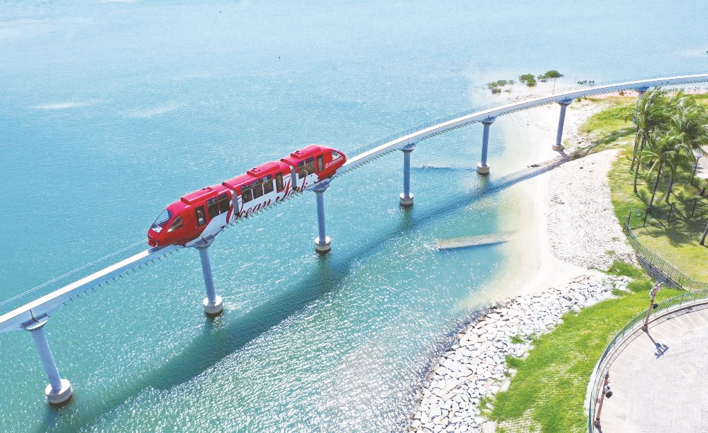 国庆假期后,机票、酒店等价格下降,不少游客来到海南享受舒适惬意的错峰游。图为海上小火车在海南海洋欢乐世界度假区行驶(无人机照片)。