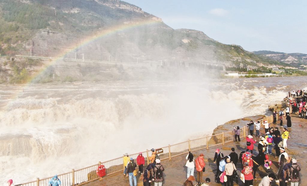 10月27日,位于山西吉县和陕西宜川县交界的黄河壶口瀑布景区天气晴好,飞溅的水雾在阳光照射下,形成一道壮美的“彩虹桥”。