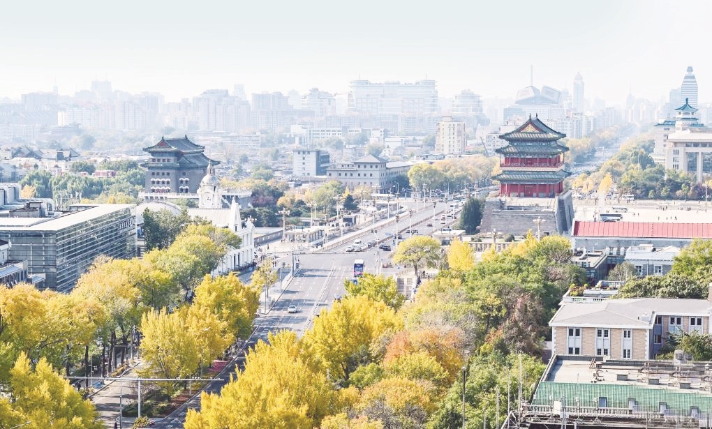 正值深秋,北京街头秋色斑斓,景色宜人。图为11月3日拍摄的北京正阳门城楼和正阳门箭楼及周边的秋色。