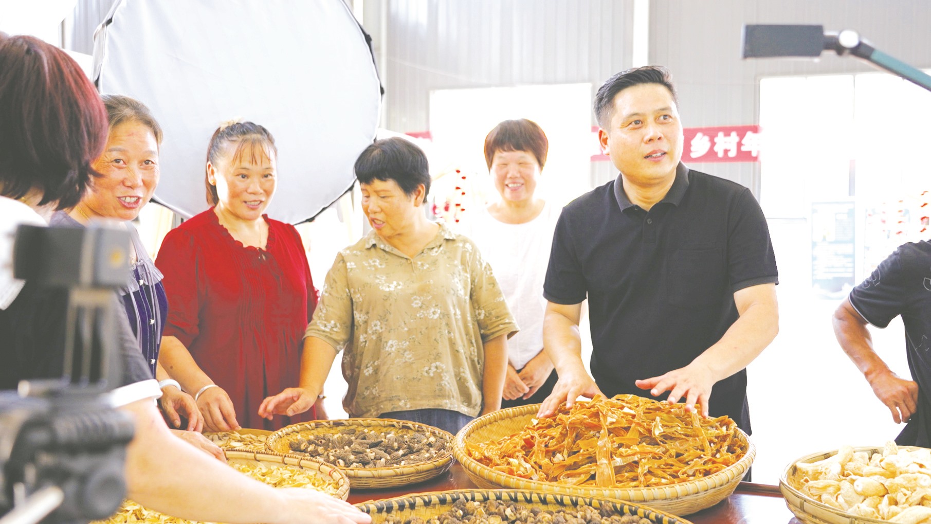 ▲江西省上饶市广信区四十八镇北山村党支部书记陈建国(右一)和村民筹备直播。(余刚 /摄)