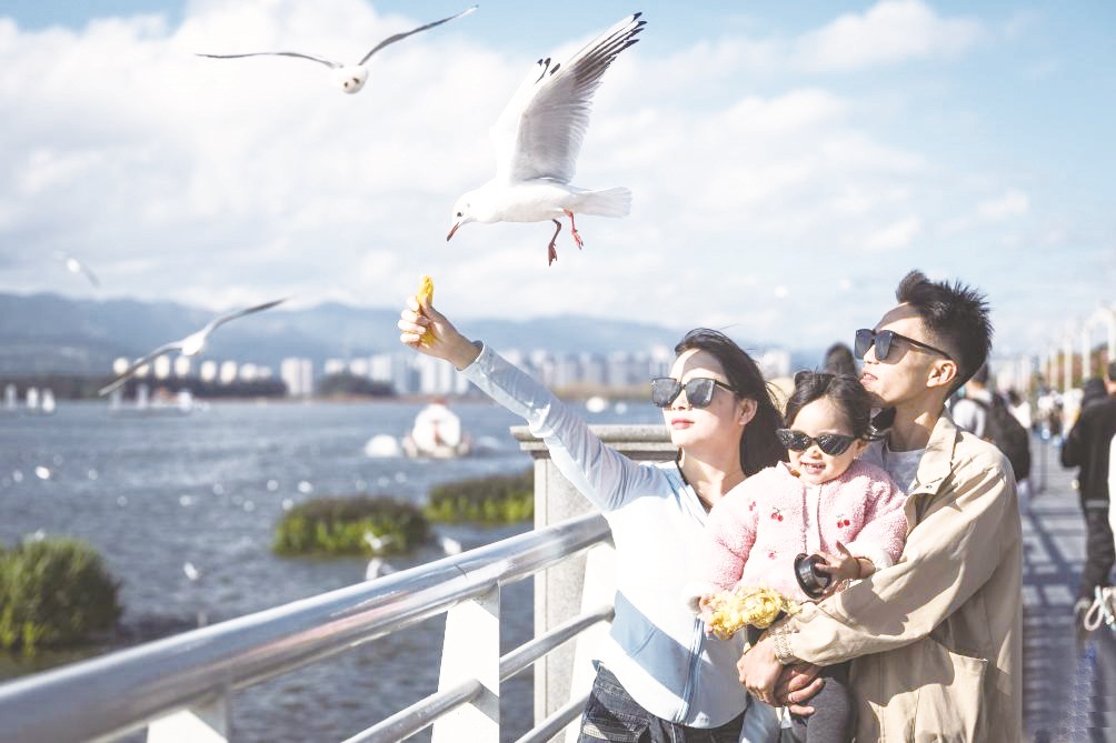 初冬昆明,红嘴鸥如约而至,跨越40载人鸥和谐的画面在“春城”上演。图为游客在云南省昆明市海埂大坝投喂红嘴鸥。