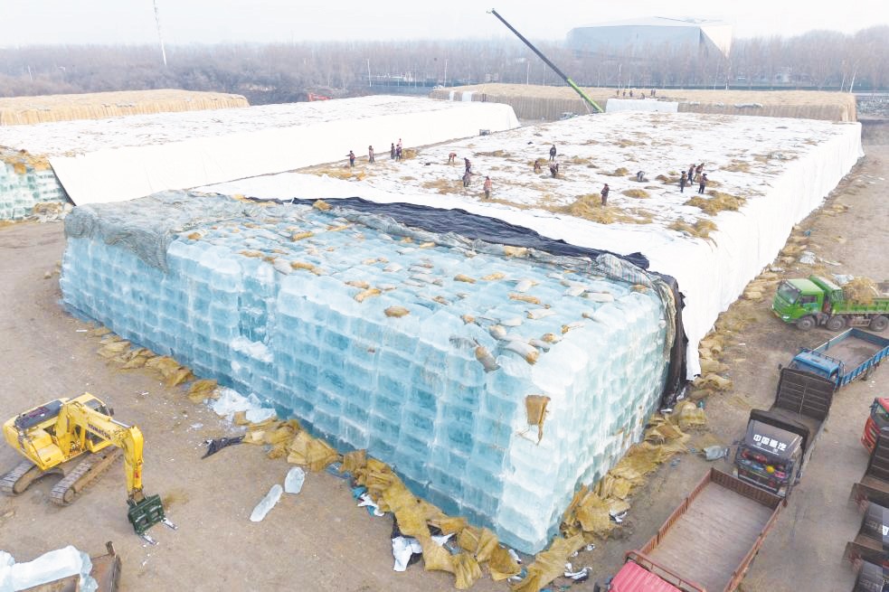 超过10万立方米的存冰将被陆续运往验冰场,经过专业人员的严格检验后,被运送至哈尔滨冰雪大世界园区用于冰建景观建造。图为工作人员拆除冰垛外层保温材料(无人机照片)。