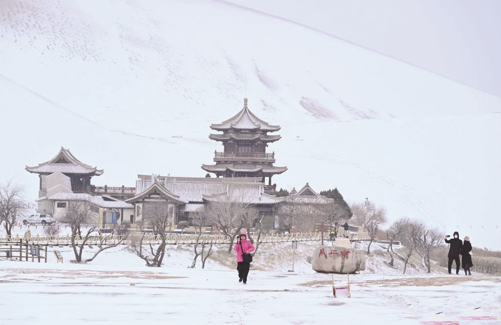 近日,受冷空气影响,甘肃省敦煌市迎来降雪,当地著名景点鸣沙山月牙泉银装素裹,美不胜收。图为游客在甘肃省敦煌市鸣沙山月牙泉景区游览。