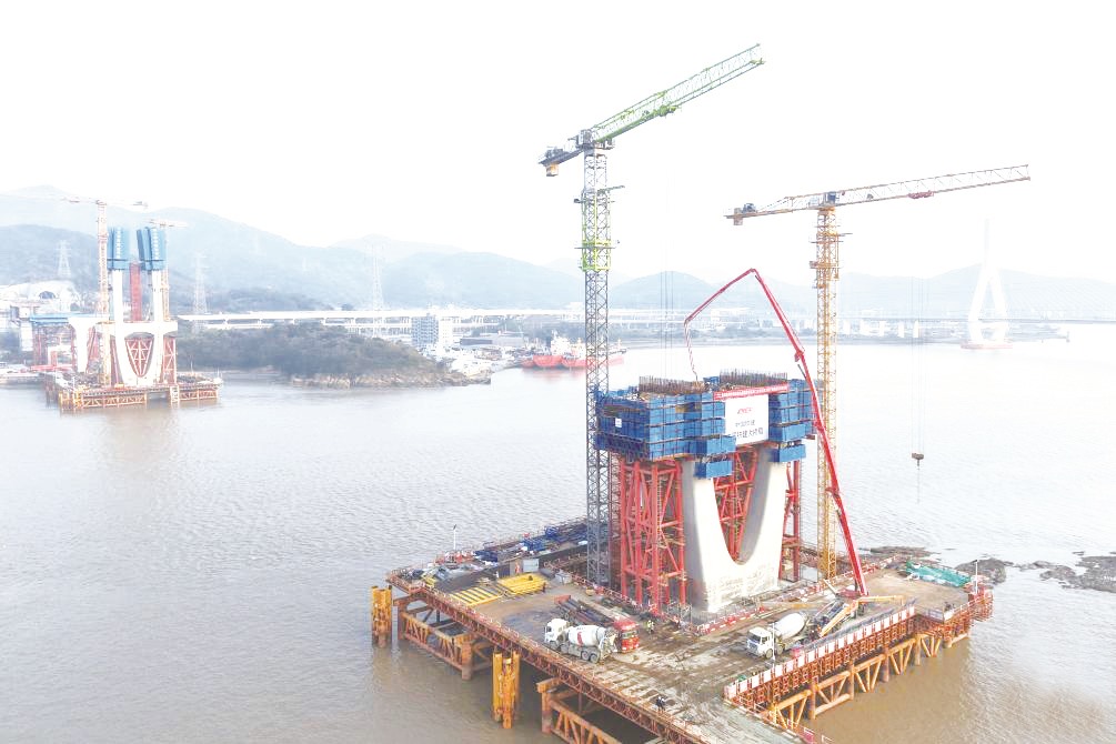 12月1日,由中国铁建大桥局承建的甬舟铁路富翅门公铁两用大桥20号主墩下横梁顺利完成浇筑,标志着大桥正式转入中塔柱施工阶段。富翅门公铁两用大桥连接舟山本岛与富翅岛,是甬舟铁路的控制性工程之一。大桥全长约1726米,主跨达388米,采用双线铁路、6车道高速公路同层布置的形式。图为拍摄的甬舟铁路富翅门公铁两用大桥20号主墩下横梁浇筑现场(无人机照片)。