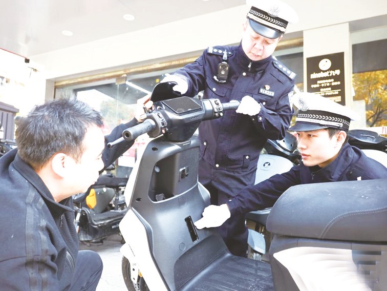 根据新版强制性国家标准《电动自行车安全技术规范》,12月1日之后,所有销售的电动自行车产品均必须符合新标准规定。新标准强化安全管理的同时,能更好满足消费者日常使用需求。图为在湖北省武汉市武昌区九号电动车平安路店,武昌区交通管理大队民警给销售人员宣讲“旧国标”电动自行车停售政策。