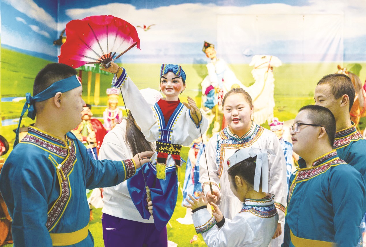 ▲残疾人朋友在呼和浩特市玉泉区第二届残疾人文艺汇演现场非遗木偶体验区学习操控木偶。