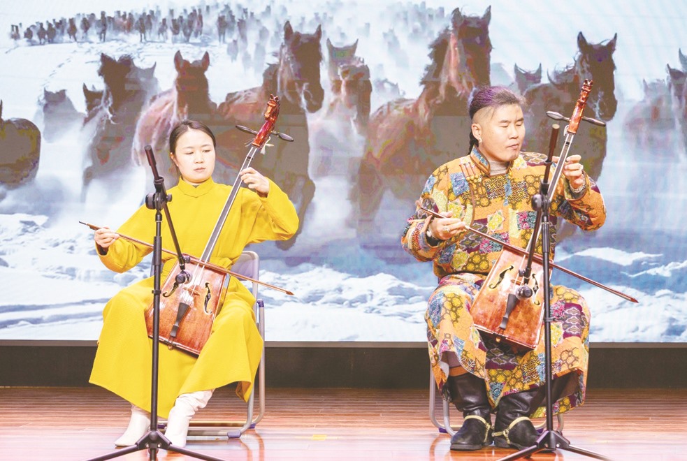 ▲乌兰牧骑队员在呼和浩特市玉泉区第二届残疾人文艺汇演上表演马头琴齐奏《万马奔腾》。