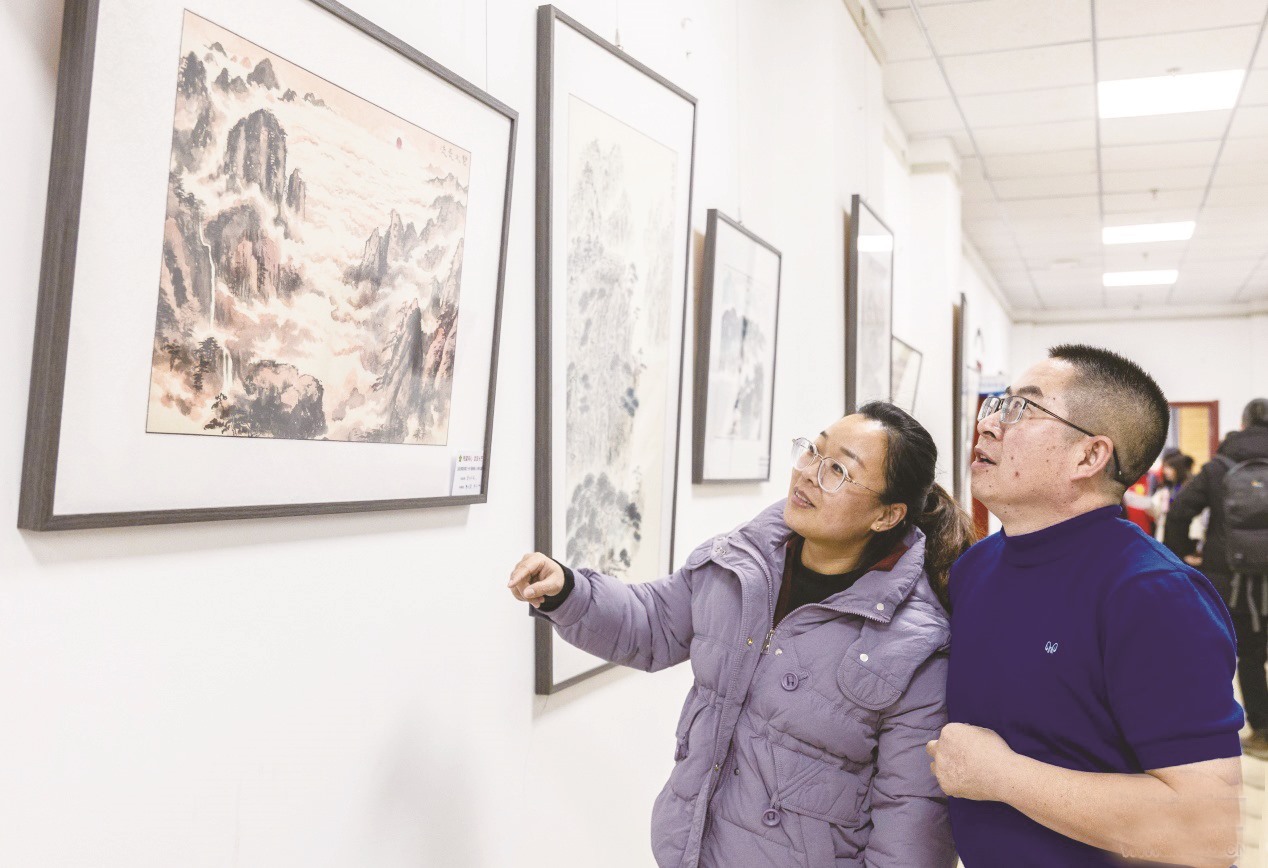 ▲市民在呼和浩特市玉泉区第二届残疾人文艺汇演现场参观展出的残疾人书画作品。
