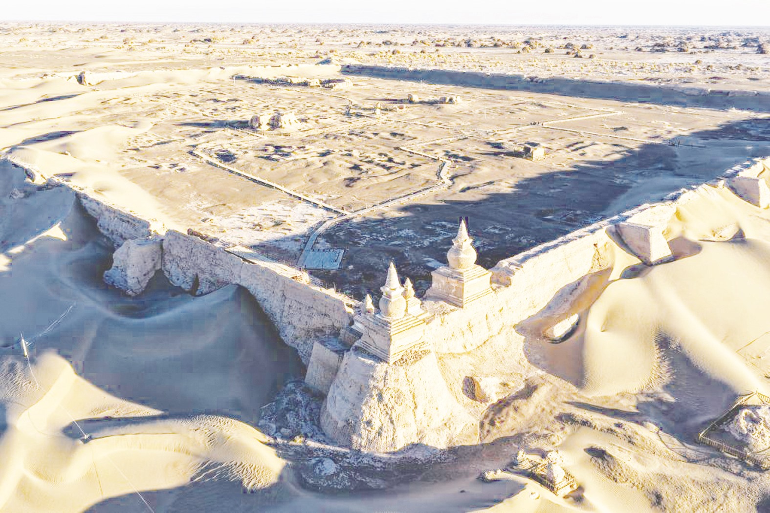 “考古发现黑水城包含大小两座城址,小城是西夏黑水镇燕军司故城,大城是元代扩建的亦集乃路故城,城内有店铺、民居,城外还有佛塔和清真寺,这里是多元文化交融之地。”李靖说,“很可惜随着历史变迁,城内大部分建筑都不存在了,只有西北角的城墙上还耸立着5座佛塔。”