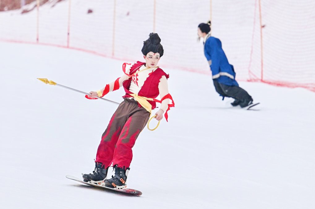 12月8日,2025四川省冬季旅游季在阿坝藏族羌族自治州汶川县羌人谷滑雪场启动。作为2025“一年四季游四川”的收官之季,四川推出四大主题精品线路和5000余场冬季文旅活动,配套发布冬游惠民礼包,以丰富产品供给和创新场景体验打造冰火相融的冬日文旅盛宴。图为一名装扮成哪吒的表演者在汶川县羌人谷滑雪场进行滑雪表演。