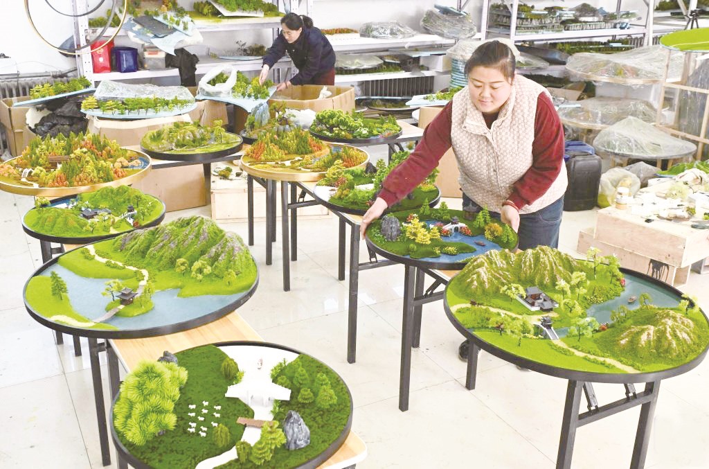 近年来,河北省石家庄市平山县上三汲乡河渠村积极培育沙盘产业新赛道,通过引入数字化、智能化技术赋能传统产业发展,打造特色产业新增长点,为当地乡村振兴注入新动能。图为工人在河北省石家庄市平山县上三汲乡河渠村一家沙盘企业制作沙盘。