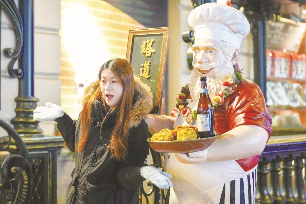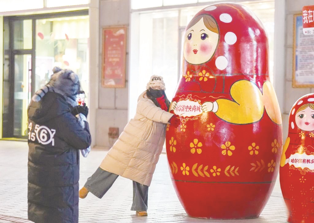 人们在哈尔滨中央大街上的一处套娃景观前拍照。
