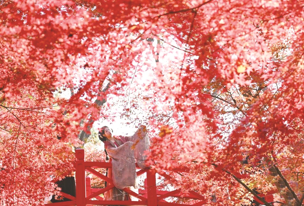 农历十月,虽然已是初冬时节,部分地区暖阳依旧,彩叶缤纷。正如南宋诗人陆游笔下的初冬:“吴中霜雪晚,初冬正佳时。丹枫未辞林,黄菊犹残枝。”图为游人在南京中山植物园观赏枫叶。