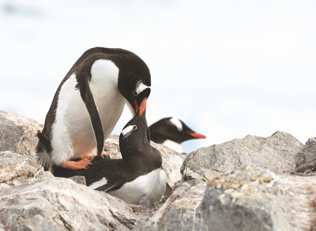 盛夏中的南极洲天气相对温和,日照时间长,是企鹅求偶和孵化幼鸟的季节,也是观鲸的理想时期。图为一对正在孵化幼鸟的企鹅。