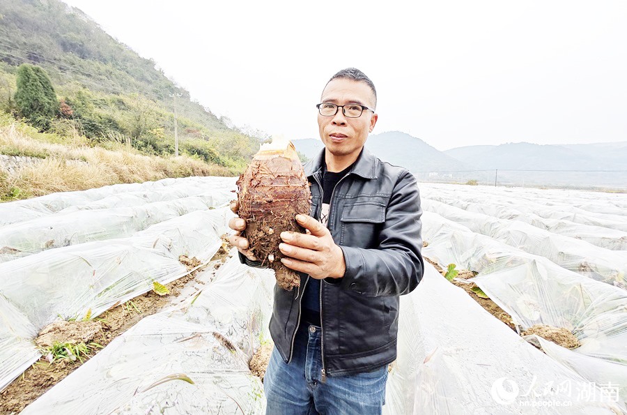 ▲胡利华展示他种植的香芋。(刘宾/摄)