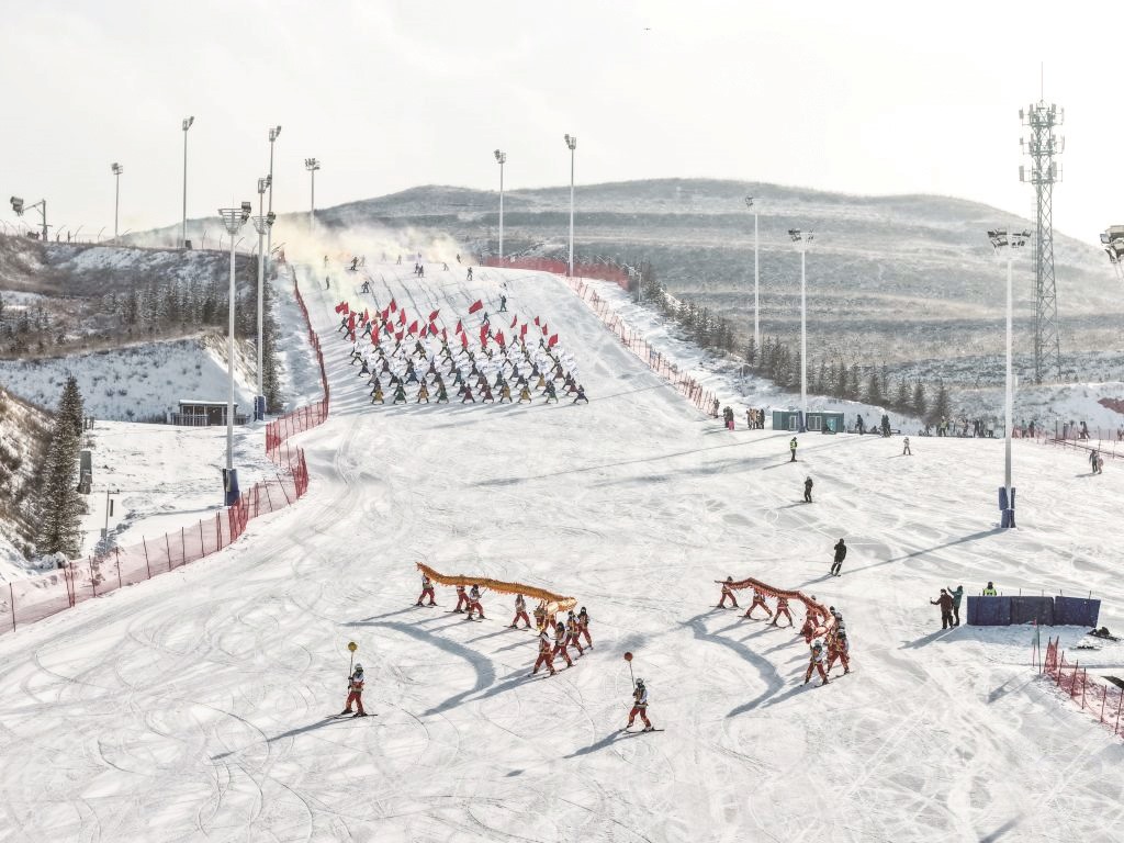 ▲在马鬃山滑雪场拍摄的启动仪式上的表演(无人机照片)。(李志鹏/ 摄)
