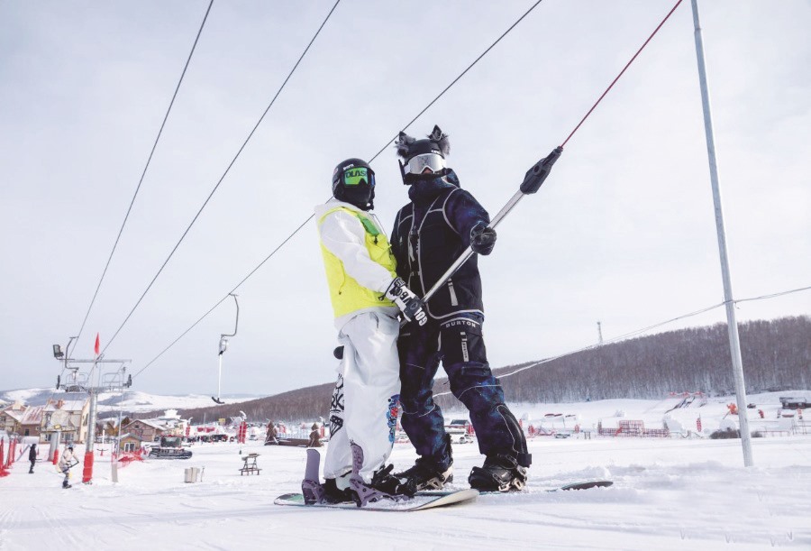 12月22日,一对情侣在内蒙古牙克石凤凰山景区,乘坐观光缆车前往滑雪场地。(吕昊俊 /摄)