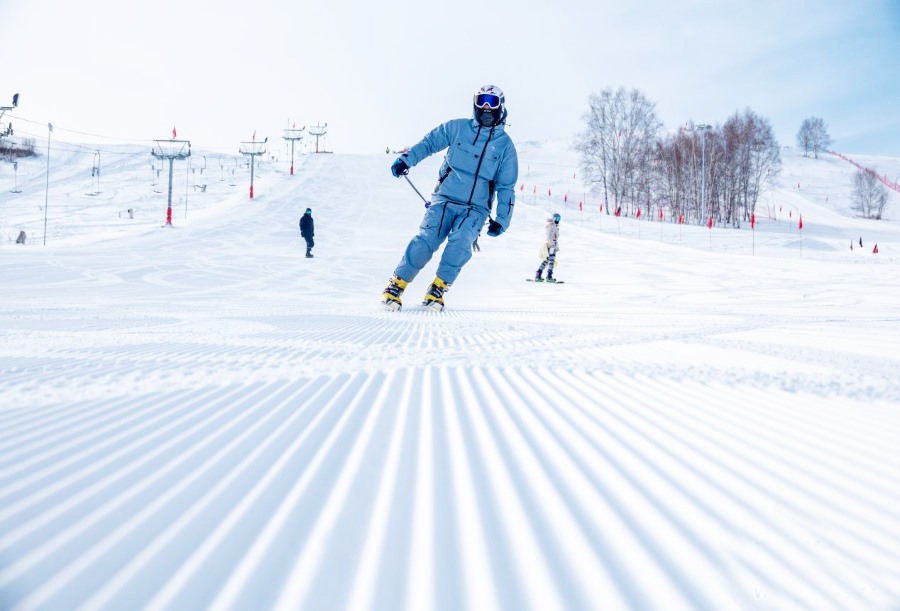 12月22日,滑雪爱好者在内蒙古牙克石凤凰山滑雪场专业雪道上飞驰。(吕昊俊/ 摄)