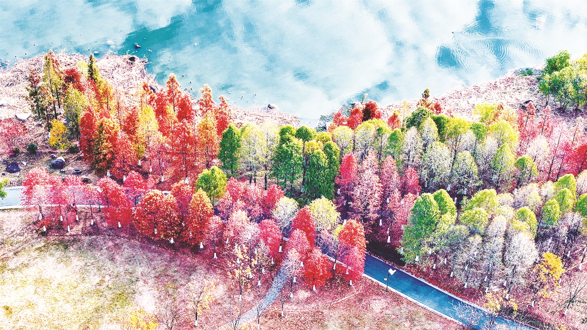 冬日时节,我国南方部分地区依旧呈现出绚丽的生态景观,色彩斑斓的林木和水生植物扮靓水岸,美景如画。图为江西省南昌市象湖湿地公园。