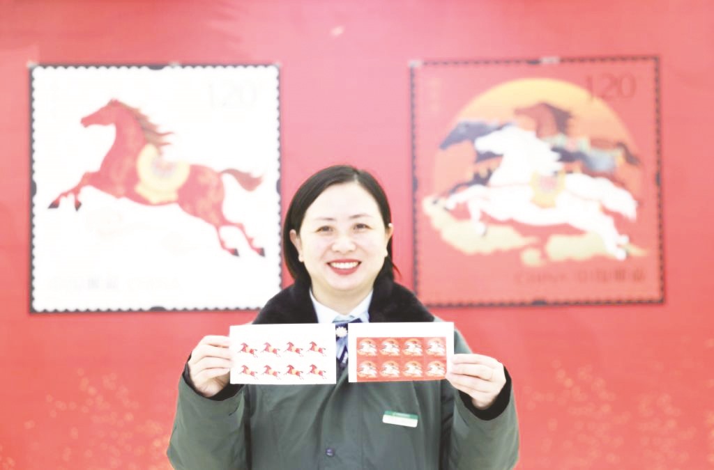 1月5日,中国邮政发行《丙午年》特种邮票一套2枚,面值均为1.2元,图案分别为“驰跃宏图”和“万骏臻福”。 图为在安徽安庆市一邮政网点,工作人员展示《丙午年》特种邮票。