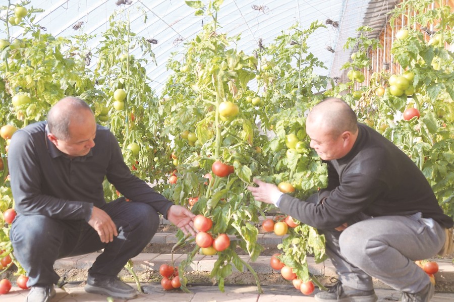 ▲农民在观察果蔬生长状况。(李富/ 摄)