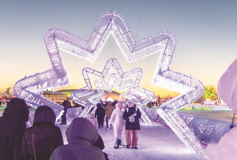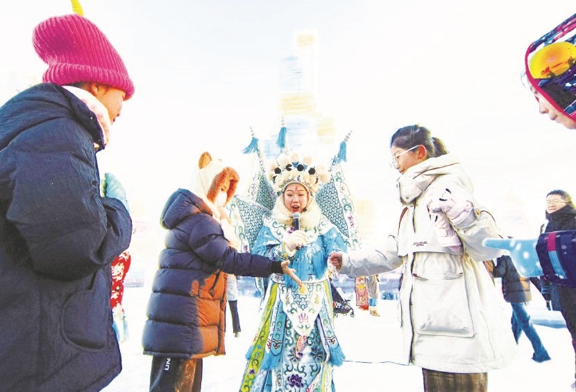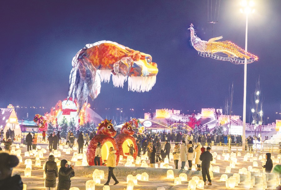 ▲游客在第五届呼和浩特欢乐冰雪节活动现场观看“飞天鳌鱼”“凤舞九天”表演。(丁根厚 /摄)
