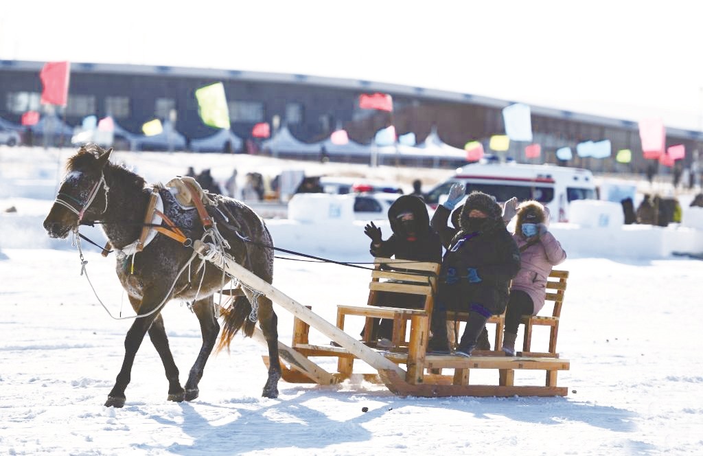 近日,内蒙古自治区乌拉盖管理区“歌游内蒙古 冰雪乌拉盖”第三届冰雪文旅主题活动在乌拉盖九曲湾景区开幕。图为游客在乌拉盖第三届冰雪文旅主题活动上体验冰雪项目。
