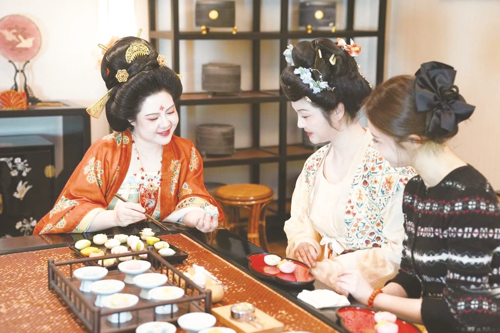 ▲李欢(左)、制果师卓美艳(中)在唐果子制作体验项目中与爱好者交流。(邵瑞/ 摄)