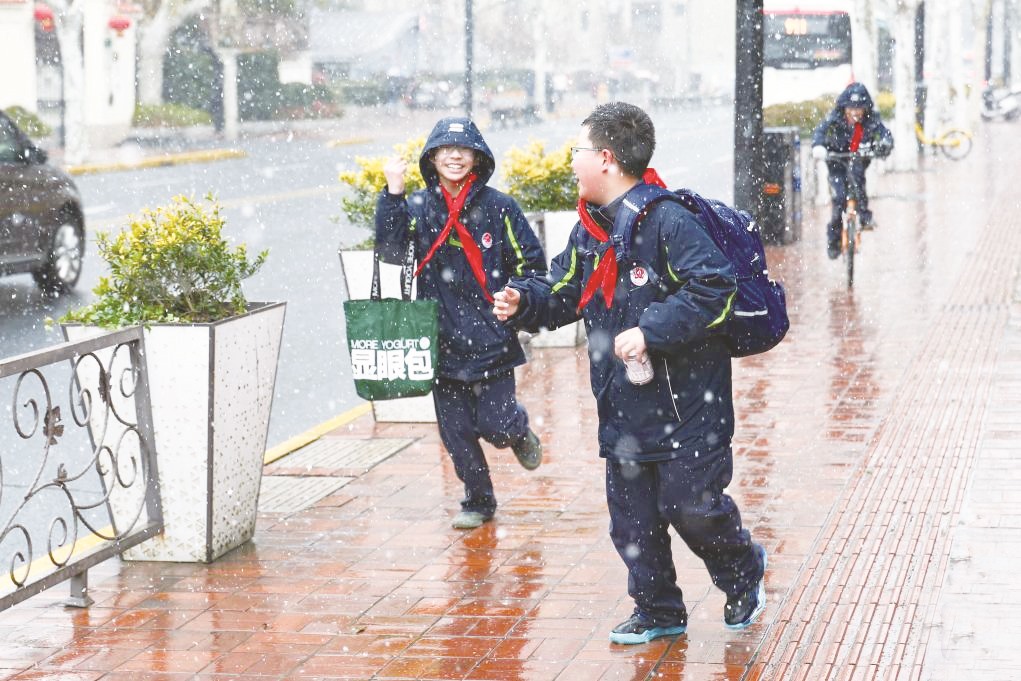 小朋友在上海市徐汇区迎雪玩耍。(王翔/ 摄)