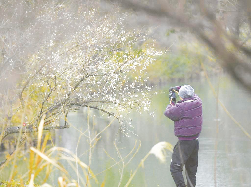 在杭州西溪湿地,一名男子在雪中拍摄白梅。(翁忻旸 /摄)