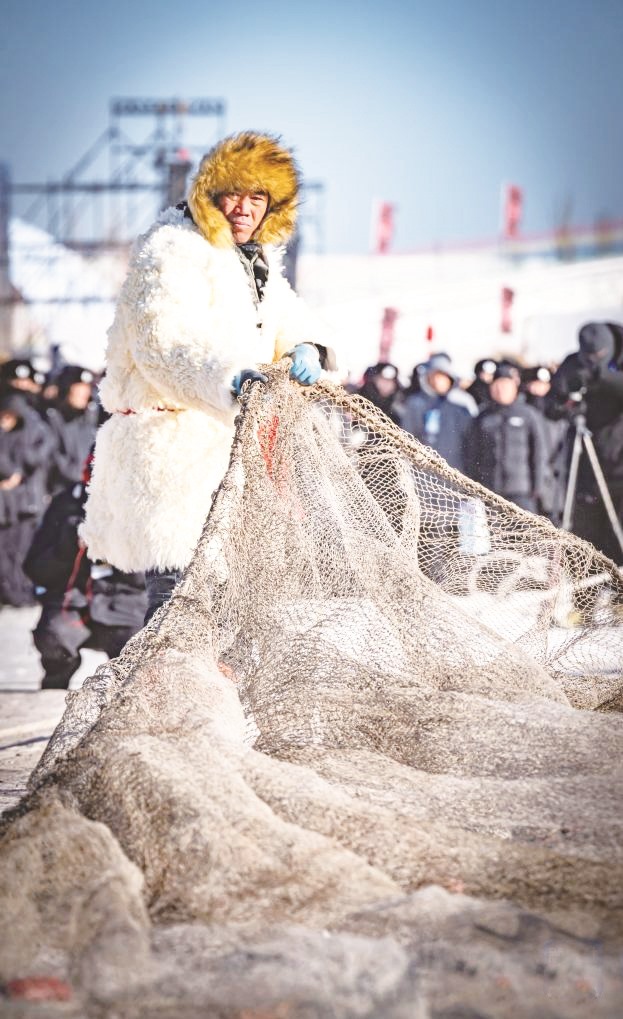 ▲在呼和浩特哈素海第四届冬捕节上,渔民们把网拉出冰面(2026年1月10日摄)。(许婷/ 摄)