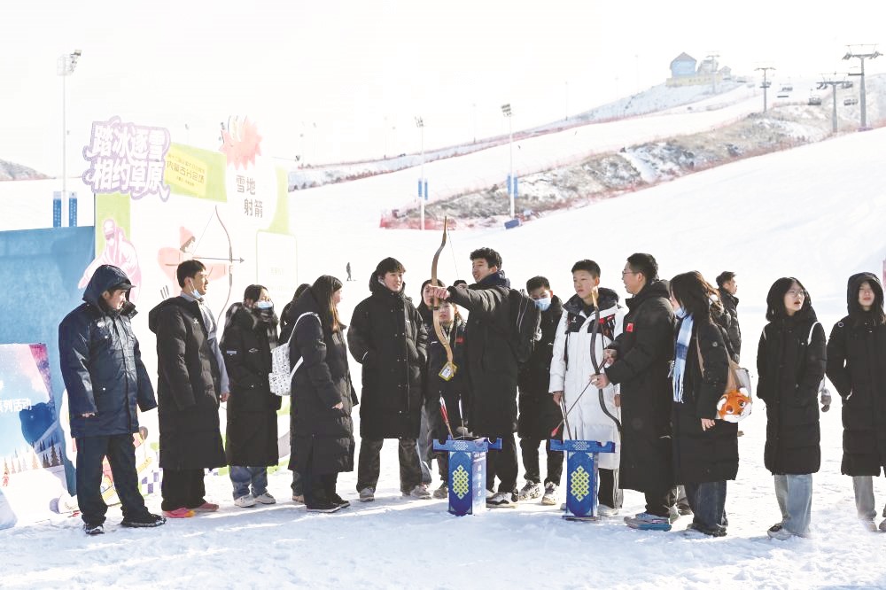 ▲游客在马鬃山滑雪场体验雪地射箭。(李志鹏/摄)