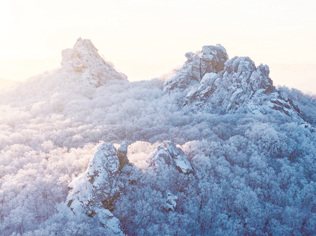 近日,位于黑龙江省双鸭山市境内的黑龙江七星山国家森林公园出现雾凇景观,朝晖映射下,霜华满山,蔚为壮观。 (韩阳/摄)
